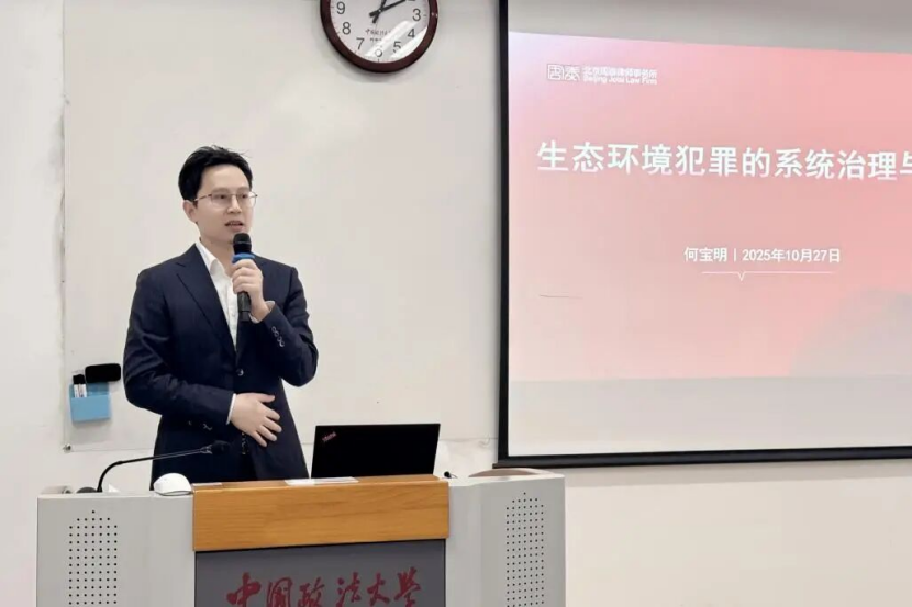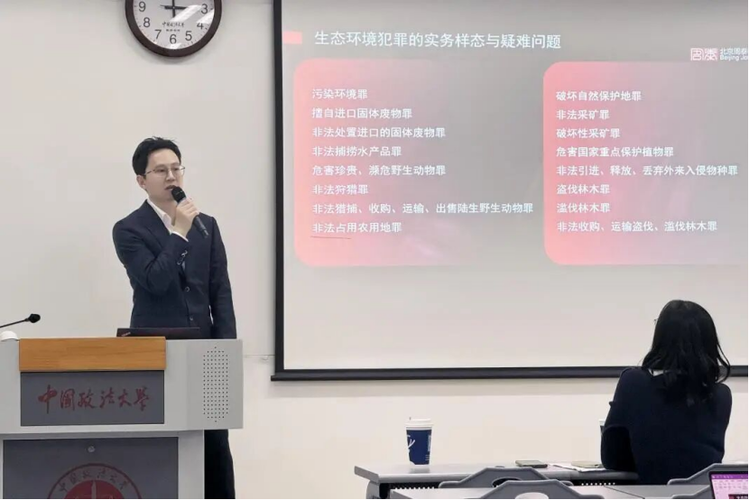 2025年10月27日14时至17时20分,中国政法大学法律学院与北京周泰律师事务所共建实务课程《刑事法前沿问题》第三讲“生态环境犯罪”顺利举行。本次课程由北京周泰律师事务所合伙人何宝明律师主讲,学院公法研究所副所长石亚淙老师主持。